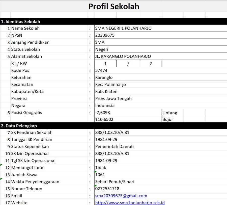 Profil Sekolah SMAN 1 11 September 2025 0 Comments 2843 Pembaca Profil SMA Negeri 1 Polanharjo Bagikan : Previous post Next post Komentar Search Category Alumni0 Info Beasiswa0 Informasi Sekolah0 Kegiatan OSIS0 PPDB0 Prestasi0 SNMPTN-SBMPTN0 Blog Terbaru Populer nol Download Tags Informasi SekolahTipsKegiatan OSIS-MPK#InformasiKarirPrestasiInformasi SekolahInformasi